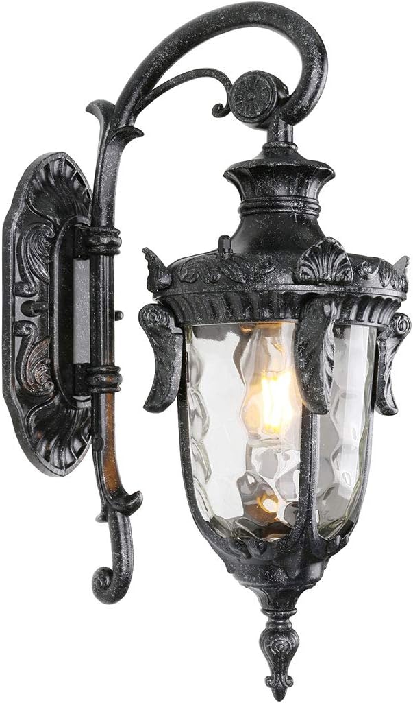 • 【Vintage Outdoor Wall Light For Home Decoration】- Featuring an unique lamp body design, dark stone finish and transparent hammered glass shade, this light fixture gives out a retro look, the decorative lamp arm also nicely complements its elegant details. A perfect choice for house entrance, garden, patio, backyard and porch.